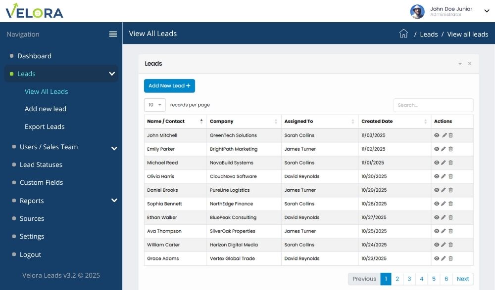 Register new leads with all relevant details, edit them anytime, and review complete histories.